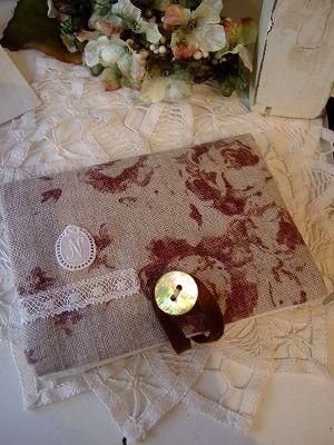 カラー ナチュラル、ブラウンパープル、素材 リネン、コットン、 サイズ 8cm×10.5cm、※フランスアンティークレース、スイスイニシャルモチーフ使用。カードが9枚入ります。