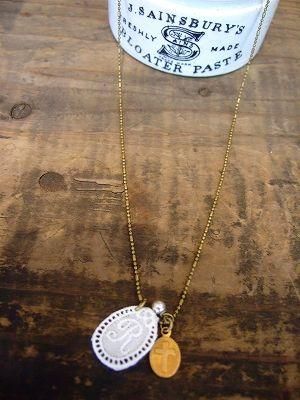 カラー ホワイト、金古美、素材 コットン、真鍮、パール、 サイズ (チェーンの長さ)40cm、(アジャスター)5cm、イニシャルモチーフ1.8×1.4cm、※スイスアンティークモチーフ、ヴィンテージグラスパール、ヴィンテージメタルパーツ使用。リネンミニポーチ付き。