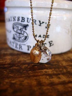 カラー 金古美、クリアー、素材 真鍮、パール、ガラス、 サイズ (チェーンの長さ)40cm、(アジャスター)5cm、シャンデリアパーツ 直径1.2cm、※フランスヴィンテージシャンデリアパーツ、ヴィンテージグラスパール、ヴィンテージメタルパーツ使用。リネンミニポーチ付き。