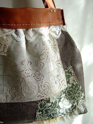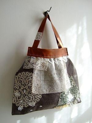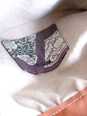 color ブラウン、アイボリー、グリーン、素材 ウール、コットン、レザー、size 36×43cm、持ち手 42cm※内布はドイツのアンティークリネンを、また内ポケットや表にパッチしたゴブランはフランスのアンティークファブリックでとっっっっても貴重で高価な布を使用した世界に1つしかない素敵なバッグです!!