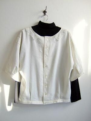 こちらは一足早くhaupiaより届きました2009Spring新作ブラウスです。オーガンジーの生地にリボン刺繍が入った繊細な襟。胸元と肩にタックが入りゆったりとちょっぴりルーズなシルエット。バックボタンで女の子らしさをプラス。随所にhaupiaらしさがいっぱいのこだわりのブラウスです。重ね着も◎
