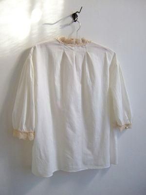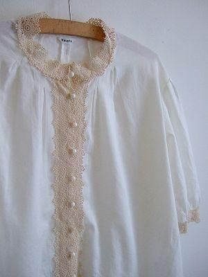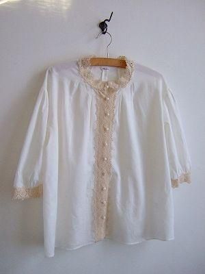 color オフホワイト、ベージュ(レース部分)、素材 cotton 91%、wool 9% (レース)cotton100% 、made in CHAINA、size M、着丈55cm、バスト108cm、袖丈32cm、肩幅 38cm