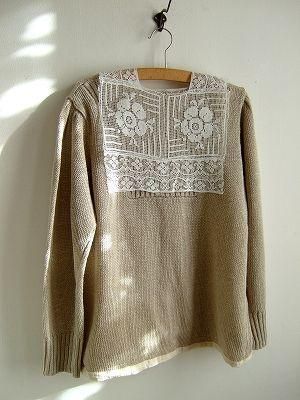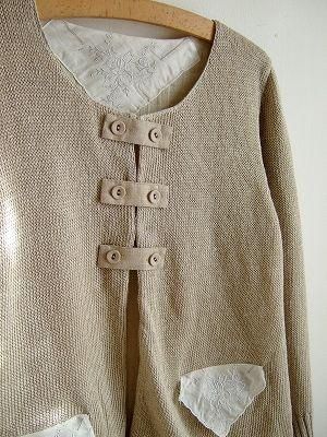 こちらは一足早くnesessaireより届きました2009Spring新作カーディガンです。3つのリネンコードのボタンホール。ポケットカバーと首の後ろの裏地にはとっても繊細なスワトウ刺繍のハンカチが・・・ノーカラーですっきりとしたデザインですが自慢したくなる所がいっぱいです。おまけに取り外し可能なレースのつけ襟付き!!とにかく素敵なカーディガンです。