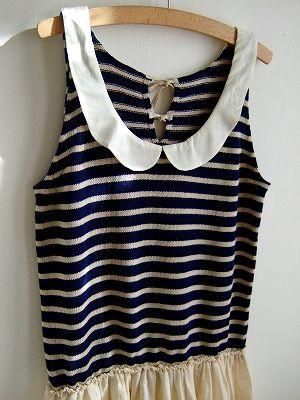 異素材の組み合わせ。ネイビーとベージュのボーダーのマリンテイストです。背中にはリネンのリボンが2つ。白いまる襟もポイントです。デニムやレギンスと合わせて・・・こだわりいっぱいの素敵なワンピースです!!color ネイビー、ベージュ、生成、素材 コットン50%、リネン50%(別布)コットン82%、リネン18%、made in CHINA、size F、着丈100cm、バスト90cm、ウエスト90cm、肩幅 38cm※裏地は付いておりません。