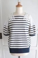 こちらは一足早くnesessaireより届きました2009Spring新作ブラウスです。胸元と袖に施したフラワーのカットワーク刺繍が見事です。よーく見るとストライプのさらっとしたコットン素材。ひらひら袖と首周りのカットがとってもキュートです。インナーに長袖カットソーを重ねたりボトムにはパンツ・デニム・スカートといろいろなコーディーネートが楽しめるブラウスです。color ブラック、素材 cotton100%、made in CHINA、size 着丈60cm、バスト98cm、肩幅 38cm、袖丈15cm