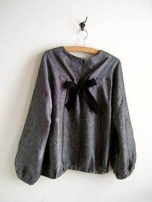 袖口がタックで詰めてありふわっとした袖を作り上げています。背中のりぼんでかわいいさをプラス。後姿も自慢です。color ブラック(オフホワイト)素材 レーヨン54%、リネン46%、リボン シルク100%、made in CHINA、size 38、着丈60cm、バスト94cm、袖丈58cm、肩幅 38cm