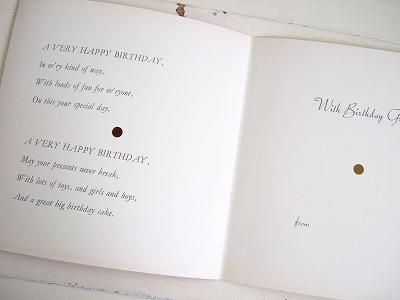 こちらはイギリスで1950年代に作られたソノシートです。デッドストックの為コンディションは◎です。丸い切りとり線が入っており、カットしてプレーヤーへ・・・ 題名でしょうか?「A VERY HAPPYBIRTHDAY」と入っておりますのでお誕生日の曲が入っているようです。どんな曲が入っているのか聞いてみたくなります。そのまま飾っておいてもとってもかわいいイラストです。
