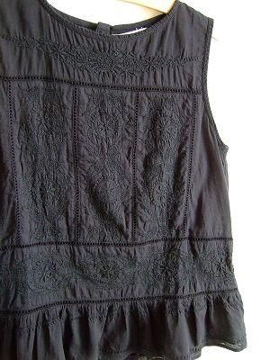 こちらはmao made より届きました新作の刺繍ブラウスです。さらっと柔らかいコットン生地には胸元・ウエスト・フロント・バックと見事なまでの刺繍が施してあります。背中ボタンと裾のフリルでかわいいさをプラス。インナーにカットソーを重ねて。またカーディガンを羽織って。元気にノースリーブで。カジュアルにさらっと着て頂ける素敵なブラウスです。color ブラック、素材 コットン100%、made in India、size M、着丈60cm、バスト95cm、ウエスト95cm、肩幅 38cm、
