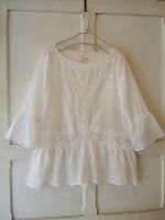 color ナチュラル、素材 リネン100%、(バテンレース部分 リネン60%、コットン40%) made in CHINA size M、着丈81cm、バスト130cm 袖丈45cm 、肩幅39cm※裏地は付いておりません。