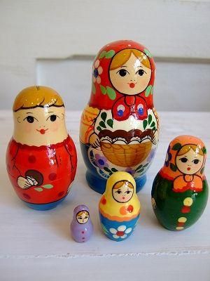 こちらはロシアの民芸品マトリョーシカです。次から次へと小さくなった女の子が出てきます。一番小さなマトリョーシカに、願いをこめて息を吹き込んで閉じこめると願いが叶うという言い伝えもあるそうです。早速マトリョーシカに願いを込めて。※一人スカーフをしていない子がいます。なんだか微笑ましいマトリョーシカです。color レッド、ブルー、素材 木製、made in RUSSIA、size 直径4.5cm×9.5cm(一番大きいマト)、5個セット、モニター等の機器設定および撮影機器などにより実際のものと色が異なる場合がございます。ご了承下さい。