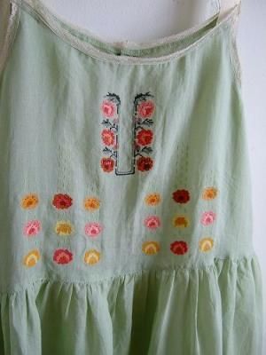 こちらはnesessaireさんより届きました新作ワンピースです。胸元にはマシーンで施した繊細なバラのクロスステッチ刺繍。首周り・アームホール・裾には繊細なチュールレースがついています。肩ひもはサテンの光沢のある生地。背中ボタンで後ろ姿も◎ギャザーが入りふわっとかわいいシルエット。何もかもがかわいくて一目惚れしてしまうキャミワンピースです。短め丈のパンツやデニムペチコート、ペチパンツを重ねて。とっても素敵なワンピースです。color ミント