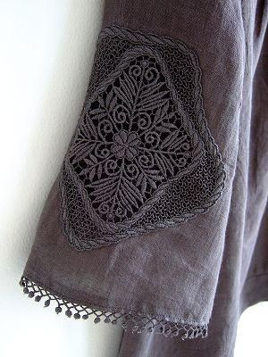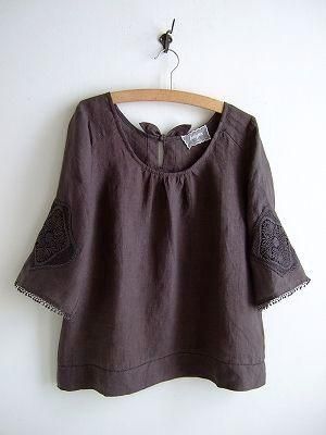 color グレー(ブラウンに近いお色です) 素材 リネン100%、(レース部分)コットン100%、made in CHINA、size 38、着丈59cm、バスト100cm、袖丈28cm、肩幅38cm