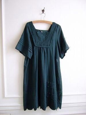 こちらはnesessaireさんより届きました新作ワンピースです。胸元にはかわいいフラワー刺繍とタックが施してあります。袖と裾、バックにもタックが。裾は波型に仕上げられて、胸元の切り替えしから入るギャザーでふわっとかわいいシルエットです。インナーに長袖カットソーやタートルを重ねても◎。ボトムにはパンツやレギンスを合わせて・・・こだわりいっぱいの素敵なワンピースです。color スミクロ(染めてあります為、光によってグレーやダークグリーンに見えます)、素材 cotton100%、made in CHINA、size F、着丈96cm、バスト95cm、 袖丈30cm、肩幅38cm、※裏地は付いておりません。