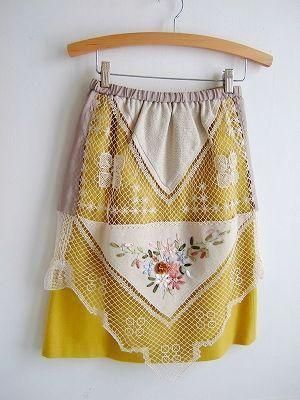こちらはnympheaさんより届きましたレース刺繍のテーブルをリメイクしたスカートです。やさしいアイボリーの糸でざっくり編んだレースにお花のリボン刺繍が施してあります。ウエストとバックにはちょっぴり光沢感のあるタフタの生地がパッチワークされ上品な雰囲気です。ウエストにはゴムが入り履き心地も◎。トップのレースとアンダースカートは縫い付けがされておりませんので、別々の着用も可能です。お持ちのスカートにも合わせて・・・緩やかなAラインのきれいなシルエット。手仕事の感じられるとっても素敵なスカートです。color イエロー、アイボリーグレーベージュ、(刺繍 グリーン、ピンク、ブルー、ブラウン、ホワイト)、素材 (アンダースカート) ウール100%、(レース部分) コットン100%、(別布部分) コットン、ポリエステル、made in Japan、size F、着丈58cm、ウエスト57cm(ウエストにゴムが入っています)、ヒップ98cm 、※裏地は付いておりません。