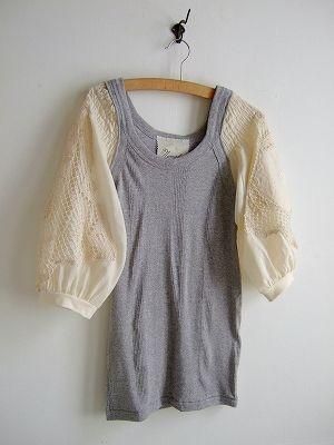 こちらはnympheaさんより届きましたレースドイリーをリメイクしましたカットソーです。メンズのタンクトップにふわっとボリュームのあるかわいい袖を付け、その上に左右異なるレースのドイリーが施されています。肩のシャーリングも◎。メンズサイズの為、着丈が少々長めとなります。たくし上げギャザーを寄せて着用下さいませ。パンツ・スカートどんなスタイルにも合わせやすい素敵なカットソーです。color グレー、アイボリー、素材 cotton100%、(別布部分 cotton、Linen) made in Japan、size F、着丈66cm、バスト68cm、袖丈39cm、肩幅 38cm、※裏地は付いておりません。