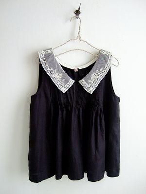 color ブラック、素材 Linen100%、made in CHINA、size F、着丈60cm、バスト98cm、 肩幅38cm、※裏地は付いておりません。チュールレース襟はスナップボタンで付いておりますので、取り外し可能です。