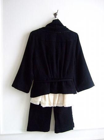 color ブラック、(キャミソール アイボリー)、素材 wool100%、(キャミソール cotton100%) made in JAPAN、size 38、着丈51cm(フロント部分81cm)、袖丈45cm、肩幅39cm、(キャミソール 着丈58cm、バスト106cm)※インナーのドットキャミソールとセットとなります。フロント部分が長くストールを羽織っているようなデザインです。