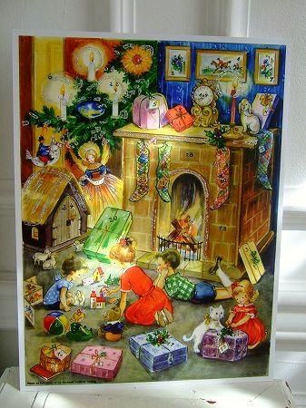 サイズ36×26.5cm、素材 ペーパー、made in Germany、12月1日から日にちと同じ数字の入った切り取り線部分を開けるとしかけが・・・数字は24まで。24日のクリスマスイヴに完成します。何が出てくるかはお楽しみ!!