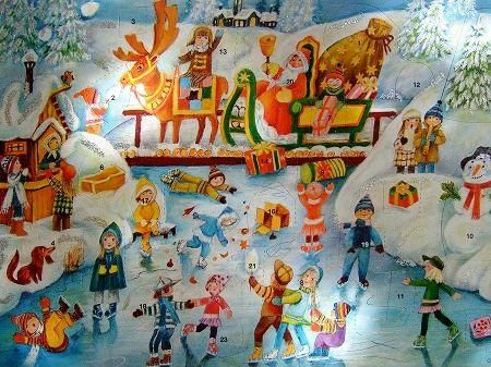 サイズ36×26.5cm、素材 ペーパー、made in Germany、12月1日から日にちと同じ数字の入った切り取り線部分を開けるとしかけが・・・数字は24まで。24日のクリスマスイヴに完成します。何が出てくるかはお楽しみ!!