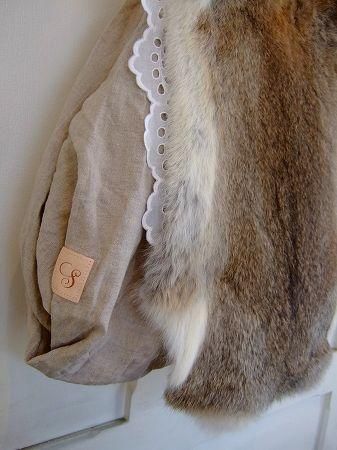 color ナチュラル、ブラウン、素材 Linen100%、(裏地 cotton100%)、ラビットファー、made in Japan、size 35cm×46cm 、持ち手40cm ※ファーの形・お色は1点1点多少異なります。予めご了承下さいませ。
