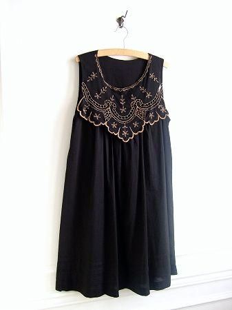 こちらはnesessaireさんより届きました新作ワンピースです。フロントのカットワーク刺繍が施された大きな襟が目を惹く素敵なワンピースです。裾のタックや背中のまるい切り替えしも◎。胸元からギャザーが入りふわっとかわいいシルエット。とってもシックなワンピースです。color ブラック×ブラウンベージュ(刺繍糸)、素材 cotton100%、made in CHINA、size F、着丈91cm、バスト95cm、肩幅38cm