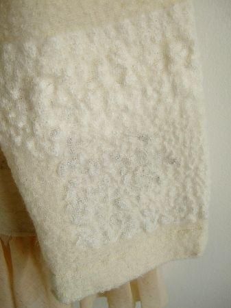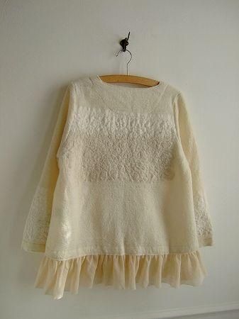 color オフホワイト、ナチュラル、素材 ウール100%、(裏地 コットン100% / 別布 コットン70%、リネン30% / レース部分 コットン100%)、made in Japan、size F、着丈68cm、バスト100cm、袖丈52cm、肩幅39cm