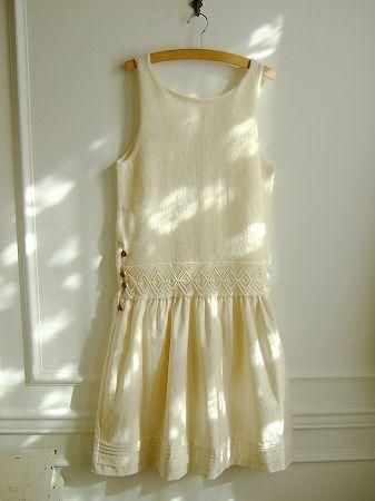 color オフホワイト×生成り、素材 ウール75%(ベビーアルパカ混)、アクリル25%、(スカート部分 コットン100%)、made in CHINA、size F、着丈101cm、バスト86cm、 ウエスト86cm、肩幅38cm、※裏地は付いておりません。