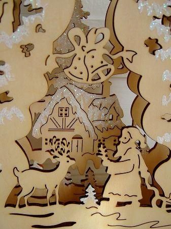 こちらはとても細かい木彫りのクリスマスライトです。サンタさんにトナカイ・ハウスにキャンドルなどとっても雰囲気のある風景!底のスライドケースを開け電池(単3×2個)を入れると小さな明かりが点きます。color ナチュラル、素材 木製、made in China、size 28×21cm、(奥行き 土台5cm、ツリー2cm) ※電池は付属致しません。予めご了承下さいませ。