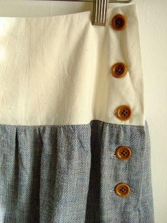 color ブルー、オフホワイト、アイボリー、素材 コットン55%、リネン30%、ウール15%、(別布コットン100%、裏地アセテート100%) made in CHINA、size F 、着丈65cm、ウエスト70cm、 ヒップ116cm