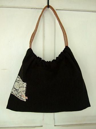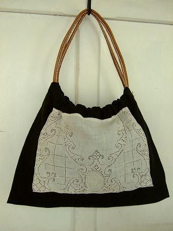 color ブラック、アイボリー、ブラウン、素材 リネン、コットン、レザー、made in Japan、size 30×41cm(持ち手 輪っかの状態78cm)※ベルギーリネン・ドイツアンティークイニシャルテープ・フランスアンティークハンドワークティーマット使用。