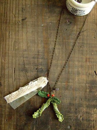 color グリーン、レッド、金古美、素材 コットン、真鍮、made in China、size リースモチーフ6cm、(リボンレース)10cm、チェーンの長さ 65cm(アジャスター5cm)