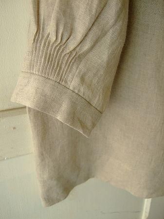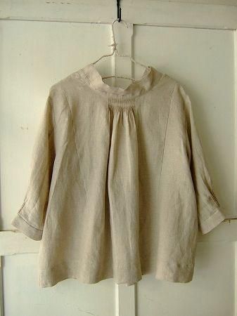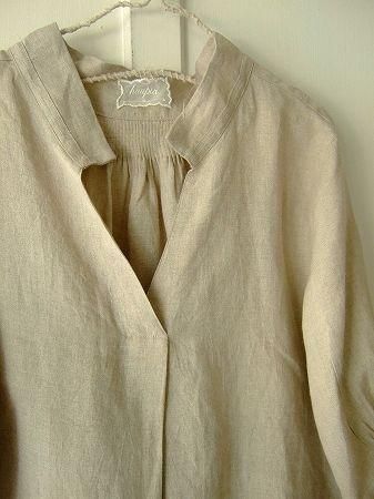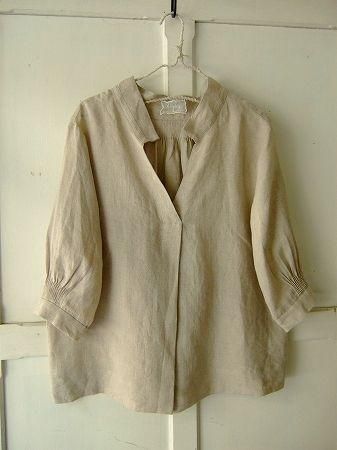 こちらはhaupiaさんより届きましたブラウスです。スタンドカラーに首元がすっきりとしたVネック。センターには大きなタックがひとつ。袖口と背中には細かいタックが施してあります。肩を落としたちょっぴりルーズなシルエット。インナーにレースのキャミソールやタートル、長袖カットソーを重ねても◎オールシーズン着て頂けるシンプルで素敵な大人ブラウスです。color ナチュラル、素材 Linen100%、made in CHINA、size 38、着丈61cm、バスト108cm、袖丈44cm、肩幅 38cm※裏地は付いておりません。