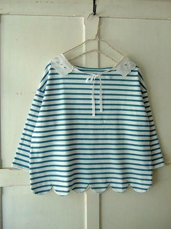 nesessaireさんより届きました春の新作カットソーです。nesessaireさんらしいカットワーク刺繍の付け襟に裾がスカラップ仕上げのマリンスタイル。肩を落としたちょっぴりルーズなシルエットの素敵なカットソーです。color オフホワイト×ブルー、素材 cotton100%、(別布/付け襟 cotton100%)、made in Japan、size F、着丈55m、バスト104cm、袖丈45cm、肩幅38cm
