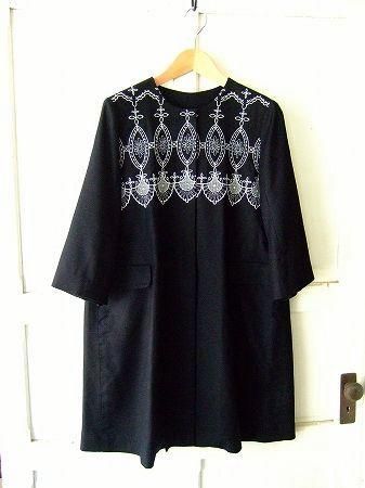 color ネイビー×(刺繍糸)アイボリー、素材 コットン61%、レーヨン20%、リネン16%、ポリウレタン3%、(裏地 ポリエステル100%)、made in China、size 38、着丈85m、バスト100cm、袖丈43cm、肩幅38cm