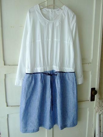 color オフホワイト、ブルー×オフホワイト、素材 コットン100%、(スカート部分 リネン100%・裏地 ポリエステル100%)、made in China、size 38、着丈104m、バスト98cm、袖丈59cm、肩幅38cm、※裏地はスカート部分のみとなり、トップには付いておりません。