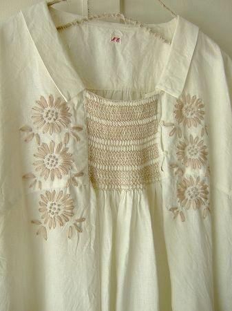 color オフホワイト、(刺繍糸)ベージュ、素材 Linen100%、made in China、size F、着丈99m、バスト128cm、袖丈48cm、(肩の切り替しからは37cm)、肩幅38cm