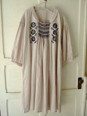 color ベージュ、(刺繍糸)ブラック、素材 Linen100%、made in China、size F、着丈99m、バスト128cm、袖丈48cm、(肩の切り替しからは37cm)、肩幅38cm