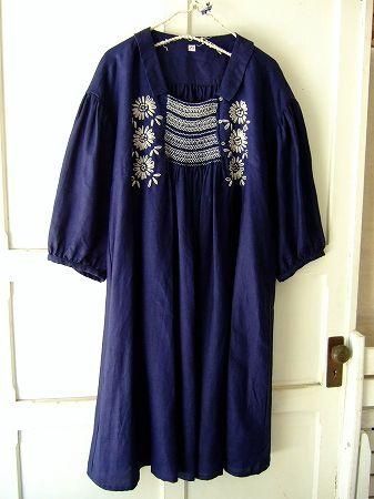 color パープルネイビー、(刺繍糸)ライトグレー、素材 Linen100%、made in China、size F、着丈99m、バスト128cm、袖丈48cm、(肩の切り替しからは37cm)、肩幅38cm