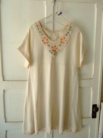 color (うすいピンクがかった)アイボリー、(刺繍糸)レッド、ブルー、ピンク、グリーン、素材 cotton70%、Linen30%、(レース部分)ナイロン100%、(別布)コットン100%、made in China、size F、着丈90m、バスト(ウエスト)98cm、袖丈20cm、肩幅38cm、※裏地は付いておりません。