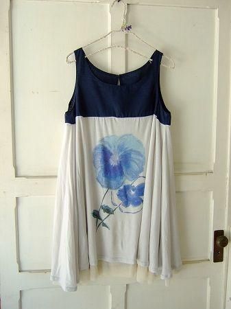 color (トップ)ネイビー×(ボトム)ライトグレー、アイボリー、素材 コットン100%、(裏地チュール部分 ポリエステル100%、別布部分 コットン100%)、made in Japan、size F、着丈83cm、バスト98cm、肩幅38cm※ハンドペイントでパンジーが描かれています。