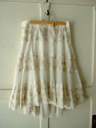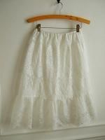 color オフホワイト、(刺繍糸)ベージュ、素材 cotton85%、Linen15%、(刺繍糸 リネン65%、レーヨン35%・裏地コットン100%)、made in Japan、size 38、着丈(フロント)56cm、(バック)70cm、ウエスト70cm、ヒップ118cm、※かわいいハンドメイドのブローチ付きです。