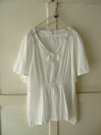 color オフホワイト、(刺繍糸 オフホワイト、シルバー)、素材 cotton100%、made in India、size M、着丈62〜68cm(サイドが長め丈となっています)、バスト95cm、袖丈25cm、肩幅38cm