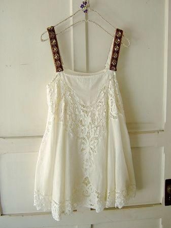 color オフホワイト、(ビーズ刺繍部分 ブラウン、ゴールド、シルバー)、素材 Linen55%、cotton45%、(レース部分 cotton100%)、made in China、size 38、着丈75cm、バスト86cm、肩幅38cm、※裏地は付いておりません。肩ひものビーズ刺繍部分はスナップボタンで留めてありますので、取り外しが可能です。