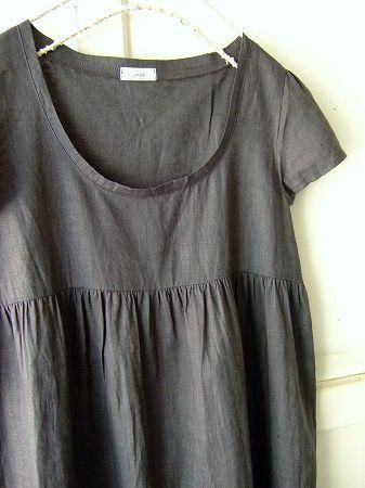 color チャコールグレー、素材 Linen100%、made in Japan、size 38、 着丈92m、バスト92cm、袖丈13cm、肩幅38cm、※裏地は付いておりません。