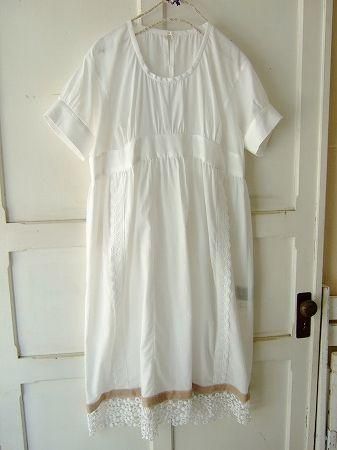 color オフホワイト、素材 cotton100%、(裏地(インナー)・レース cotton100%) made in JAPAN、size 38、着丈104cm、バスト95cm、袖丈20cm(袖の切替しより16cm)、肩幅 38cm、※取り外し可能なキャミソールタイプのアンダードレス付きです。