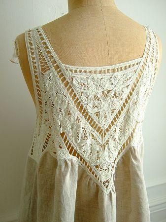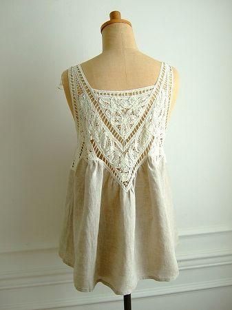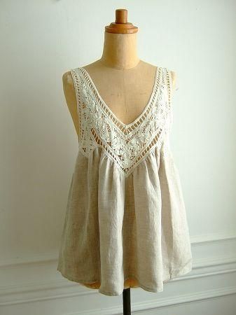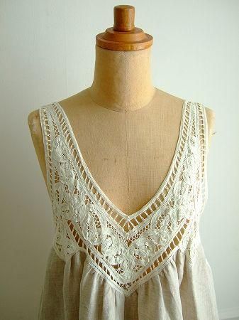 color ナチュラル、アイボリー、素材 Linen100%、(バテンレース部分 cotton100%)、made in China、size F、着丈66cm、バスト102cm、肩幅38cm、※前後どちらを前にしても着用頂けます。