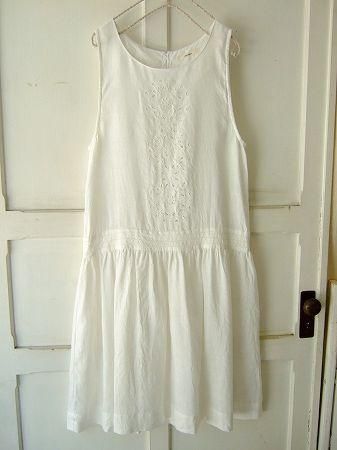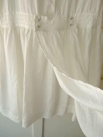 color オフホワイト、素材 Linen100%、made in China、size F、着丈105cm、バスト96cm、肩幅38cm、※裏地は付いておりません。背中が開き、後ろのスカート部分がラップスカートのように合わせのデザインとなっております。