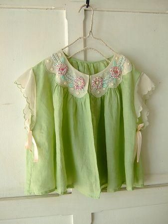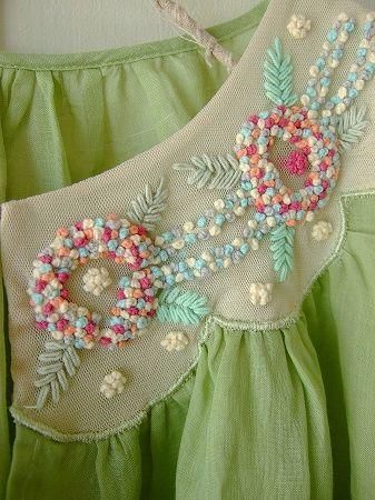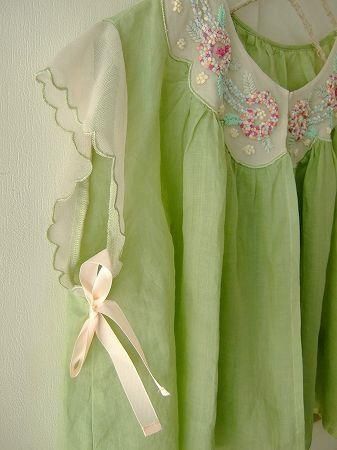 color グリーン、アイボリー、(刺繍・・・アイボリー、パープルピンク、オレンジ、グリーン、ブルー、リボン・・・ピンク)、素材 Linen100%、(別布 ナイロン100%/コットン100%)、made in China、size F、着丈46cm、バスト130cm、袖丈8cm、肩幅38cm、※裏地は付いておりません。フロントに鍵ホックが1つ付いています。