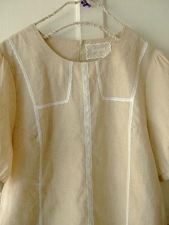 color ナチュラル、オフホワイト、素材 Linen50%、cotton50%、(レース部分 ナイロン90%、コットン10%)、made in China、size 38、着丈54cm、バスト98cm、袖丈25cm、肩幅38cm