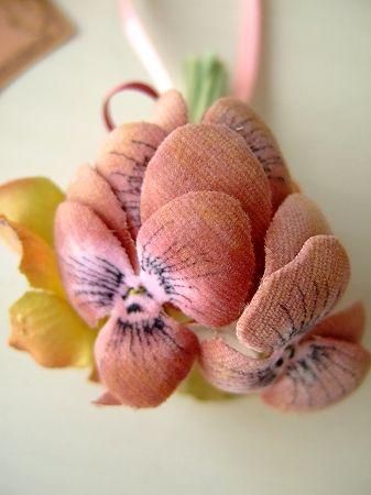 こちらは作家Te・Teさんがハンドメイドで制作して下さいました素敵なコサージュオーナメントです。1点1点生地をカットしそれから手染めをし、お花に仕上げて下さいました。とっても手の込んだ素敵なオーナメントです。お部屋のインテリアにまたカゴバッグに付けても素敵!!革ひもを通してネックレスにも・・・使い道いろいろの素敵なコサージュオーナメントです。color パープル、グリーン、ピンク、素材 コットン、made in JAPAN、size モチーフ 約直径6.5cm、全長12cm